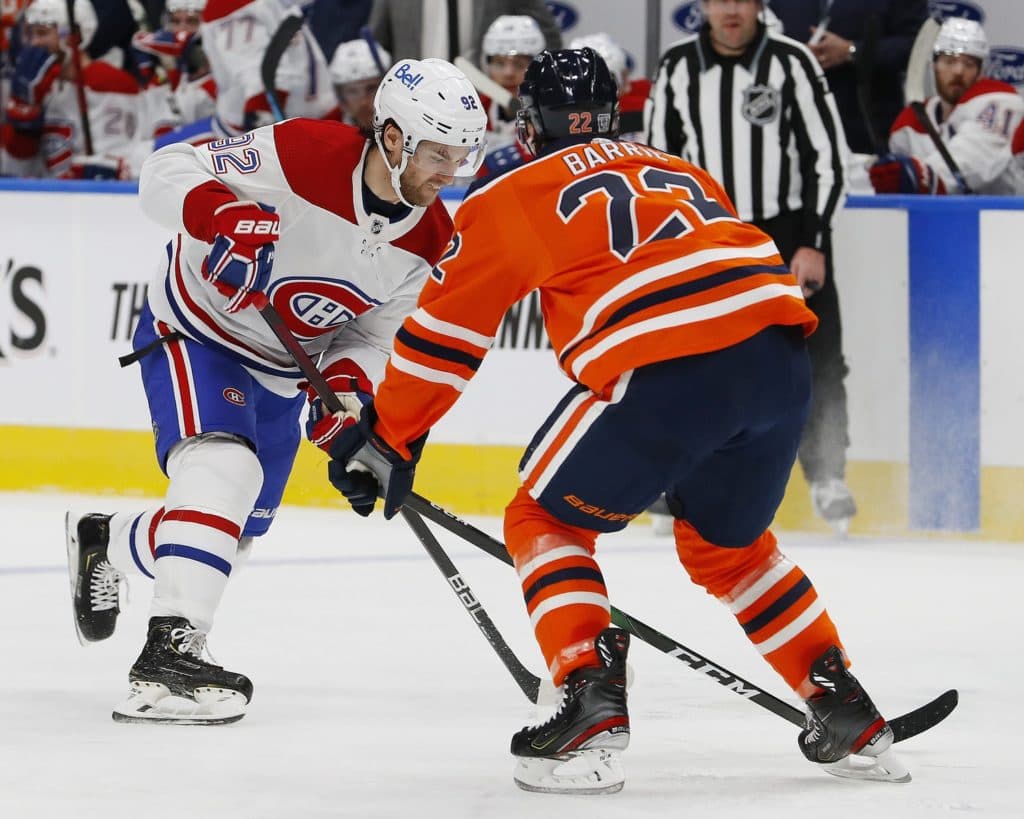 Jan 16, 2021; Edmonton, Alberta, CAN; Edmonton Oilers defensemen Tyson Barrie (22) blocks a shot by Montreal Canadiens forward Jonathan Drouin (92) during the second period at Rogers Place. Mandatory Credit: Perry Nelson-USA TODAY Sports