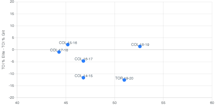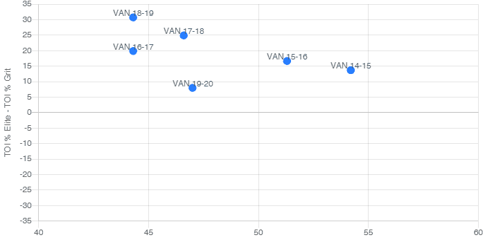 Here, PuckIQ is showing his dangerous Fenwick For%. It was second highest in his career, but he played fewer minutes against elite competition. That is important to note.