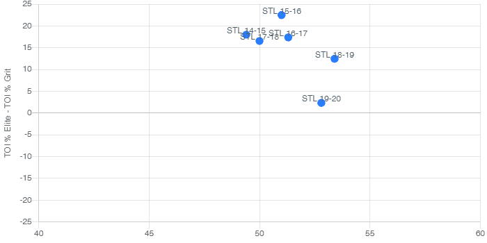 He is a bonafide #1 D-man. If he makes it to free agency Holland should make him an offer. His chart at PuckIQ.com shows you what a legit #1 D-man can do and how often he plays against elite forwards. It is also interesting to note that this past season he played less against elites than ever before. That is because the Blues also have Colton Parayko on the right side, and he can play against the top players as well. What a luxury for coach Craig Berube.