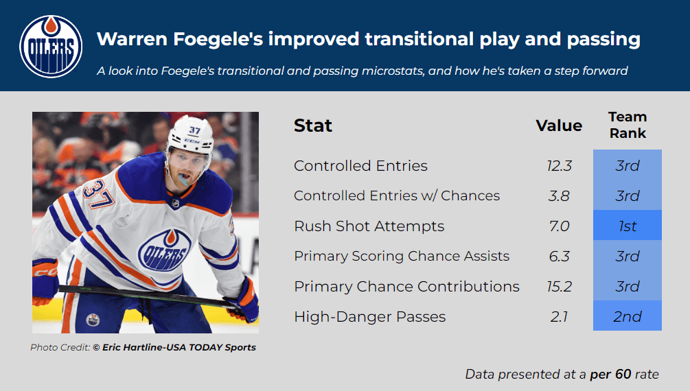 Foegele’s passing has also taken a massive step forward. As mentioned earlier, Foegele ranks seventh in the NHL in primary assists per hour, and his passing microstats support that this isn’t entirely a mirage. Foegele ranks 3rd on the team in primary scoring chance assists per hour, and second in HD Passes per hour, even marginally ahead of Leon Draisaitl.