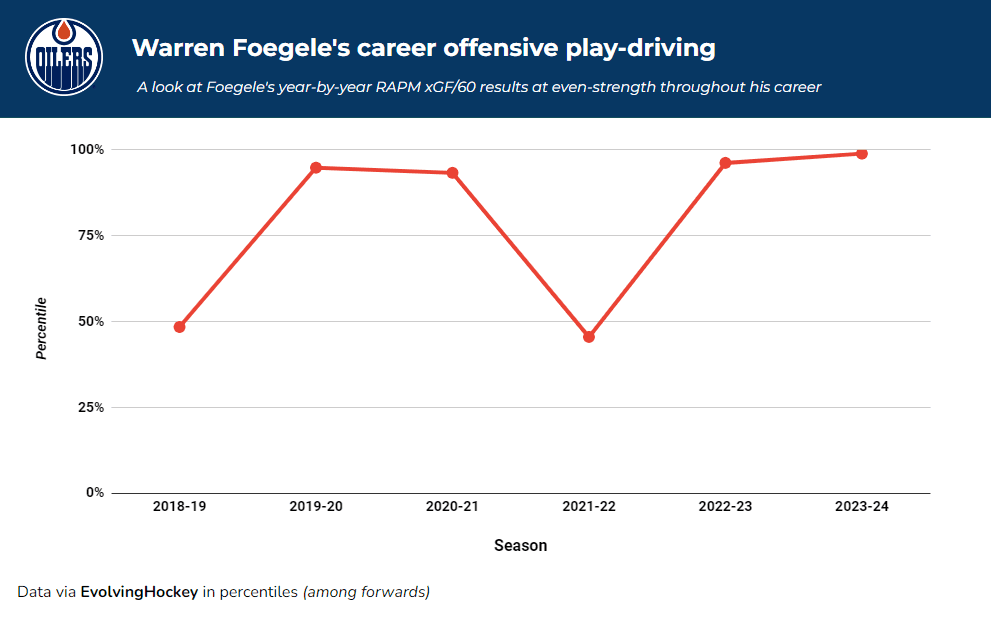Foegele’s play was fairly unimpressive in his first season with Edmonton, but throughout his entire career, Foegele’s offensive impact on driving scoring chances has been excellent. Last season, it ranked in the 97th percentile among the NHL’s forwards, while it ranks in the 99th percentile this season.