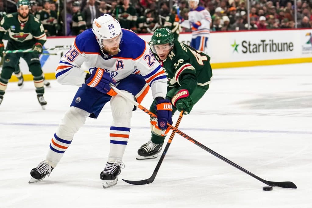 Dec 1, 2022; Saint Paul, Minnesota, USA; Edmonton Oilers center Leon Draisaitl (29) protects the puck from Minnesota Wild defenseman Jared Spurgeon (46) during the second period at Xcel Energy Center. Mandatory Credit: Brace Hemmelgarn-USA TODAY Sports
