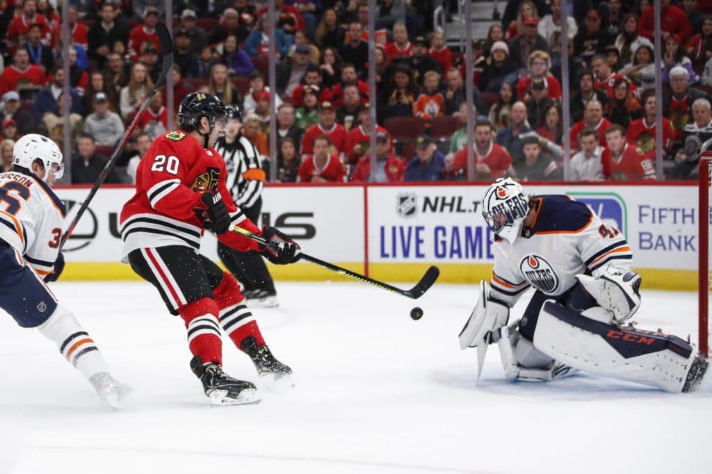 Oct 14, 2019; Chicago, IL, USA; Chicago Blackhawks left wing Brandon Saad (20) shoots the puck against Edmonton Oilers goaltender Mike Smith (41) during the second period at United Center.