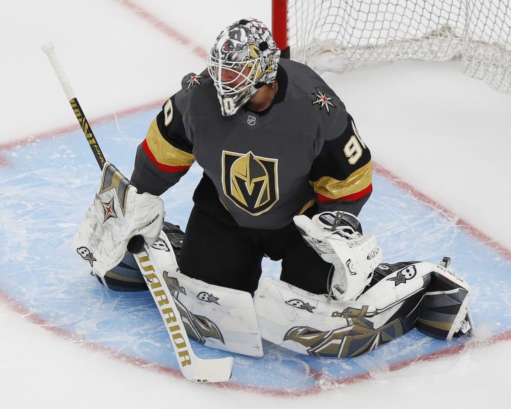 Aug 11, 2020; Edmonton, Alberta, CAN;Vegas Golden Knights goaltender Robin Lehner (90) makes a save during warmup against the Chicago Blackhawks in game one of the first round of the 2020 Stanley Cup Playoffs at Rogers Place. Mandatory Credit: Perry Nelson-USA TODAY Sports