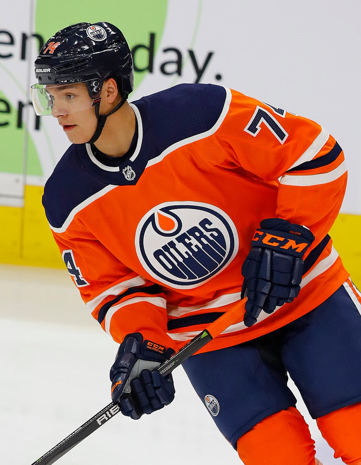 Mar 1, 2018; Edmonton, Alberta, CAN; Edmonton Oilers defensemen Ethan Bear (74) skates during warmup against the Nashville Predators at Rogers Place. Mandatory Credit: Perry Nelson-USA TODAY Sports