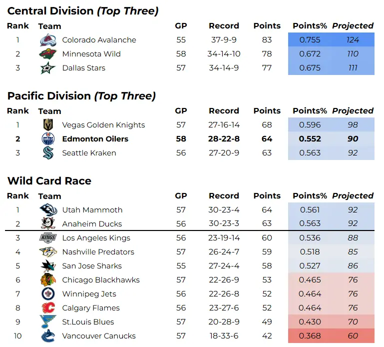 Simply put, the Oilers will need to elevate their play over the final quarter of the season, particularly with many more divisional matchups ahead. Their current points percentage is projected to be the lowest it has been in the past seven seasons, including this one. While their playoff odds remain statistically favourable, nothing is guaranteed, and merely settling for a wild‑card spot could mean a first‑round matchup against Colorado. Securing a top‑three finish in the Pacific must be the clear priority.