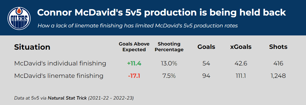 In spite of hitting the impressive 150-point mark, McDavid was actually a bit unlucky at 5v5 this past season. For the past two seasons, his linemates have consistently finished less than expected, and it’s largely held back McDavid’s 5v5 production rates. In 2022-23, McDavid ranked first in the league in shot and scoring chance assists per 60 (per AllThreeZones), but 86th in actual 5v5 assists per 60.