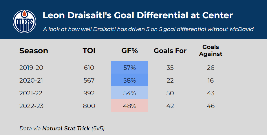From 2019-20 through 2021-22, Draisaitl consistently performed well centering his own line, posting a 5v5 goal differential of 57 percent, 58 percent, and 54 percent in those three seasons respectively. For reference, McDavid was at a goal share of 56 percent without Draisaitl, and the rest of the team without McDavid was at an awful 43 percent. In this span, Draisaitl had very clearly proven he could drive his own line.