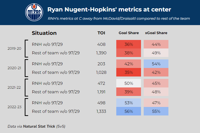 There’s no consistent trend in these year-to-year results. RNH was quite poor as the team’s 2C in 2019-20. In a smaller sample, he was much better in 2020-21, and his goal share was strong in 2021-22 (although his shot and scoring chance numbers were not). In 2022-23, the bottom six was at the best it’s ever been, and the team without McDavid/Draisaitl produced superior metrics without RNH as opposed to with.