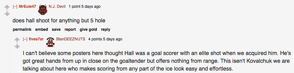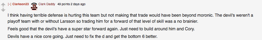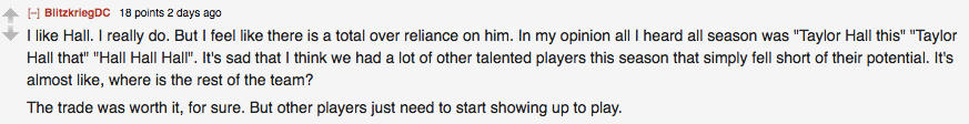 I think these Redditors above said it best, but the end of the day, reading these comments about Hall made me sad and brought back terrible memories from the past ten years. Hall is going through the exact same process he went through with Edmonton. Unless New Jersey wins the lottery this year and rebuilds fast, there’s no way Hall sticks around for half as long. My guess is that Taylor Hall is out of New Jersey at the end of his contract in three years. Here’s hoping he does find his way onto a playoff team, and can eventually win a Stanley Cup. Not before us, of course.