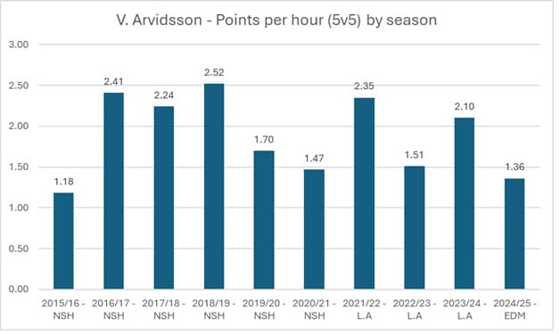 One last thing worth pointing out is Arvidsson’s production in this year’s playoffs. He dressed for only 15 of the 22 games and finished 12th in even-strength ice time among forwards (164 minutes). But he did put up two goals and five assists in these limited minutes, which translates into a rate of 2.55 points per hour. That was the second highest among all Oilers forwards, only behind McDavid.