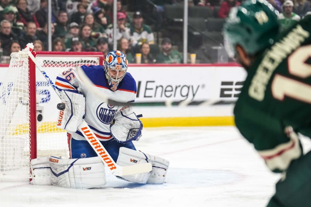 Dec 1, 2022; Saint Paul, Minnesota, USA; Edmonton Oilers goaltender Jack Campbell (36) makes a save during the first period against the Minnesota Wild at Xcel Energy Center. Mandatory Credit: Brace Hemmelgarn-USA TODAY Sports
