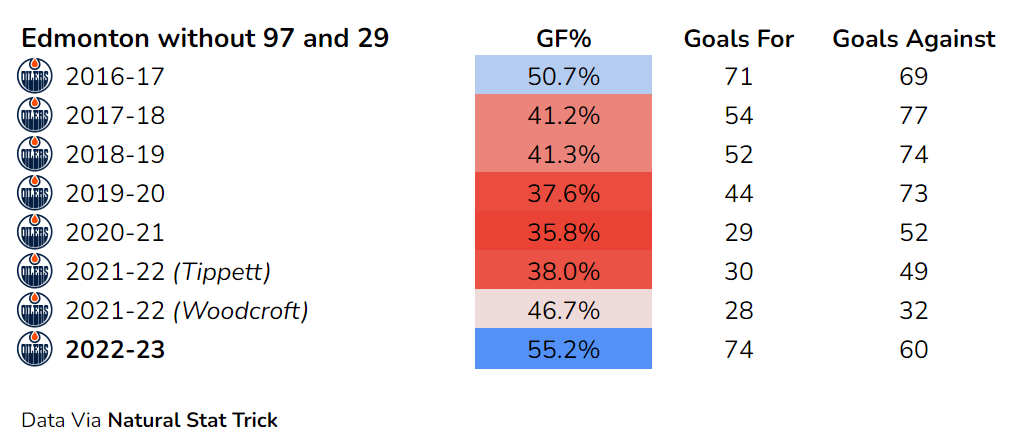 For years, Edmonton’s bottom six was atrocious, as the team was consistently getting out-scored by a massive margin when both McDavid and Draisaitl were not on the ice.