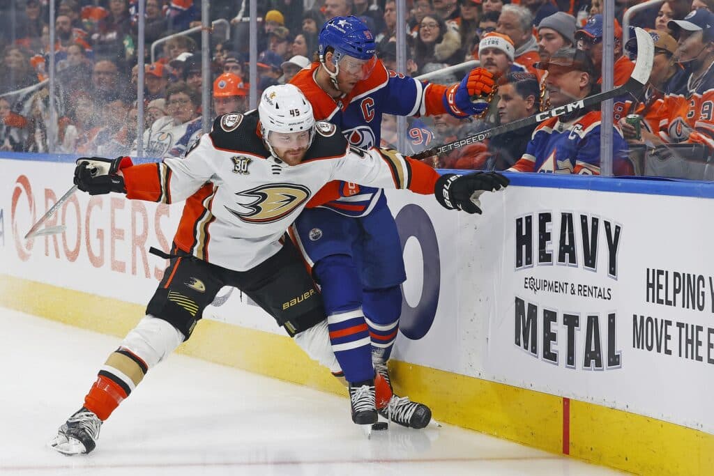 Nov 26, 2023; Edmonton, Alberta, CAN; Anaheim Ducks forward Max Jones (49) and Edmonton Oilers forward Connor McDavid (97) battle along the boards for a loose puck during the first period at Rogers Place. Mandatory Credit: Perry Nelson-USA TODAY Sports