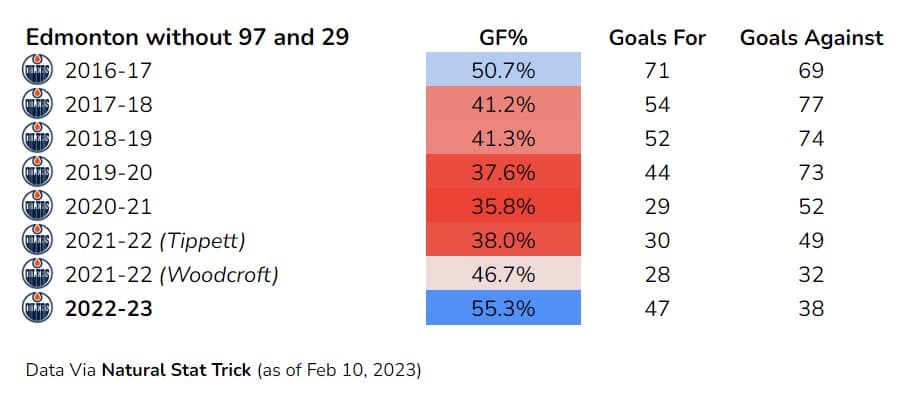 Here’s a look at Edmonton without McDavid and Draisaitl this season, compared to past years: