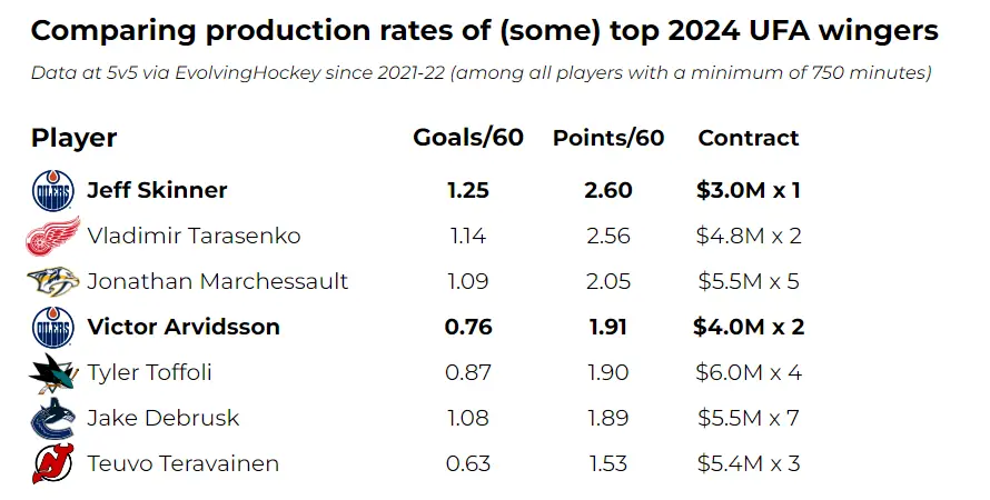 Warren Foegele, Draisaitl’s most common winger in 2023-24, produced 37 points at 5v5 in 82 games. Arvidsson produced 31 points at 5v5 in 66 games in 2021-22, a 39-point pace over 82 games. If Arvidsson is healthy, hitting 40+ points at 5v5 next to Draisaitl is not an unreasonable expectation; for reference, a list of players that produced around ~40 5v5 points in 2023-24 include Sam Reinhart, Mark Scheifele, Jason Robertson, and Aleksander Barkov, which is quite strong company.