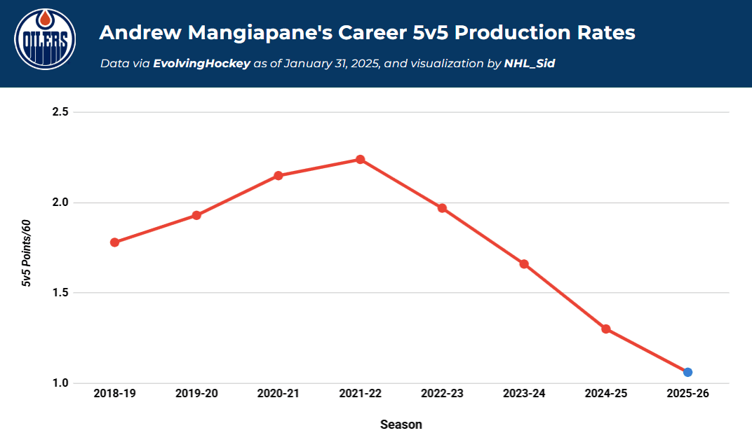 Furthermore, his metrics are not far from off from his underwhelming season with Washington in 2024-25. Many, including me, had thought he would improve in Edmonton, particularly considering the fact that Mangiapane’s most common centre with the Capitals was Lars Eller, whereas he would have the opportunity to play with McDavid and Draisaitl in Edmonton. But even with better linemates, Mangiapane has continued to underwhelm.