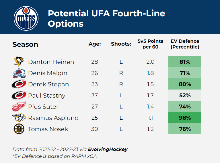 Still, if Edmonton is adamant about signing a depth center, there are some UFA options available. Here’s a list of some potential options with decent 5v5 production rates and/or strong defensive results: