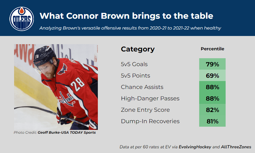 Additionally, from 2020-21 through 2021-22, Brown averaged 11.3 scoring chance assists per 60 and 1.7 high-danger passes per 60 (per AllThreeZones). These rates would rank 3rd on the Oilers, only behind McDavid and Draisaitl; he’s a sneaky good play-maker, much better than given credit for. Brown is also a strong transitional forward and forechecker.