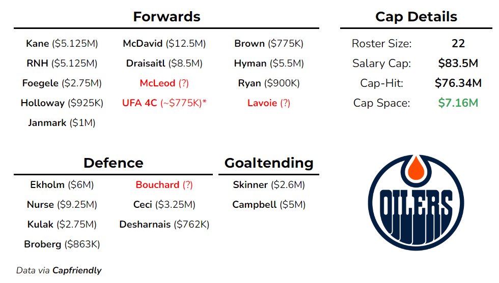 They have roughly $7.16M in cap space to sign Bouchard, McLeod, Lavoie, and a 4C. Personally, I’m not opposed to the idea of running a 21-man roster to ensure Bouchard gets signed for multiple years, but realistically, it seems likely that Edmonton will move ahead with 22 players.
