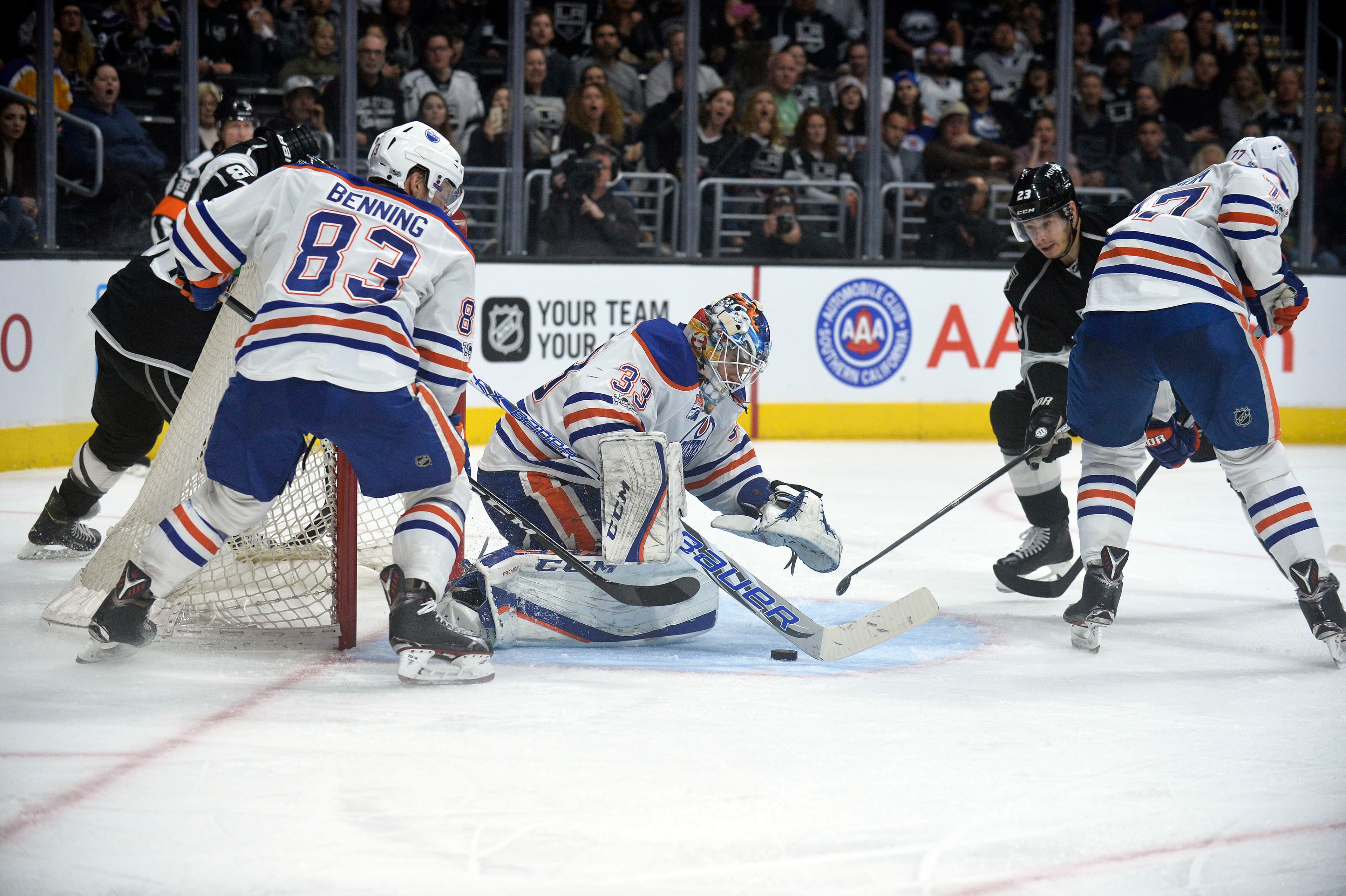 April 4, 2017; Los Angeles, CA, USA; Edmonton Oilers defenseman Matt Benning (83) and defenseman Oscar Klefbom (77) help goalie Cam Talbot (33) defend the goal against Los Angeles Kings right wing Dustin Brown (23) during the second period at Staples Center. Mandatory Credit: Gary A. Vasquez-USA TODAY Sports