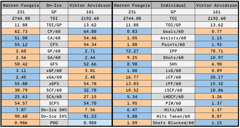 Warren Foegele vs. Viktor Arvidsson, 5v5 per hour between 2021-22 and 2023-24. Data via Natural Stat Trick.
