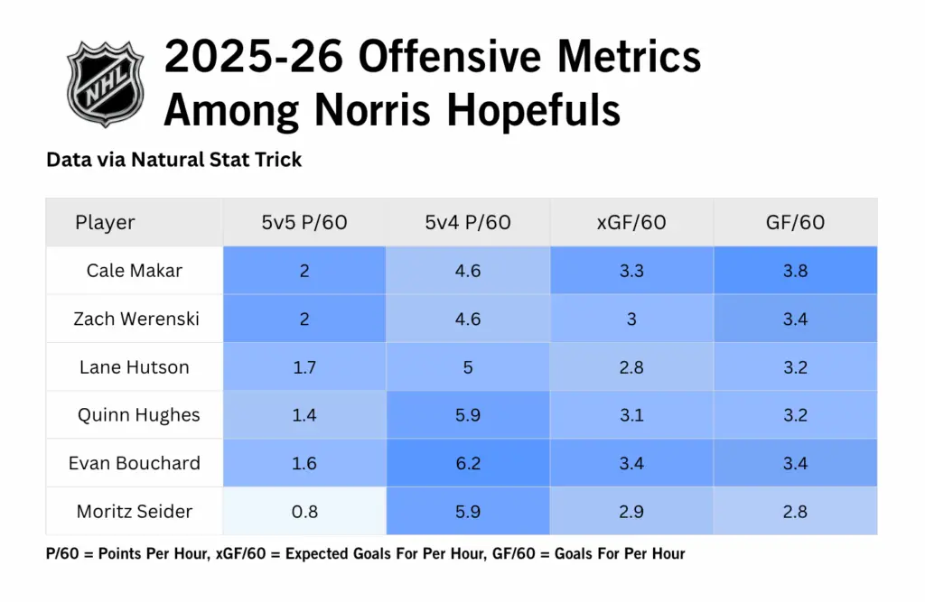 Besides, it’s not like other Norris contenders don’t play with elite talent — just look at the embarrassment of riches in Colorado that Makar has to work with. I’ll give Hughes a ton of credit for producing on the worst team in the NHL before he was mercifully traded out of Vancouver, but I’ll never penalize players like Bouchard and Makar for producing with elite forwards and getting the best out of them.