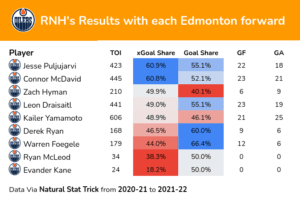 Nugent-Hopkins’ most common linemate in the past few seasons has been Kailer Yamamoto, but the duo has been out-scored 21 – 25 at 5v5, while posting a below-average expected goal differential. Nugent-Hopkins posted strong goal differential results with Foegele and Ryan, but as indicated by their poor xGF%, it was likely unsustainable over a larger sample.