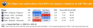 At the bottom of this list is the DRY line. In 2019-20, the line out-scored opponents at an astounding ratio of 28 – 8, and still drove possession and scoring chances at a prominent rate, with a 55% expected goal differential. That season, they were the major reason for Edmonton’s resurgence in the second half.