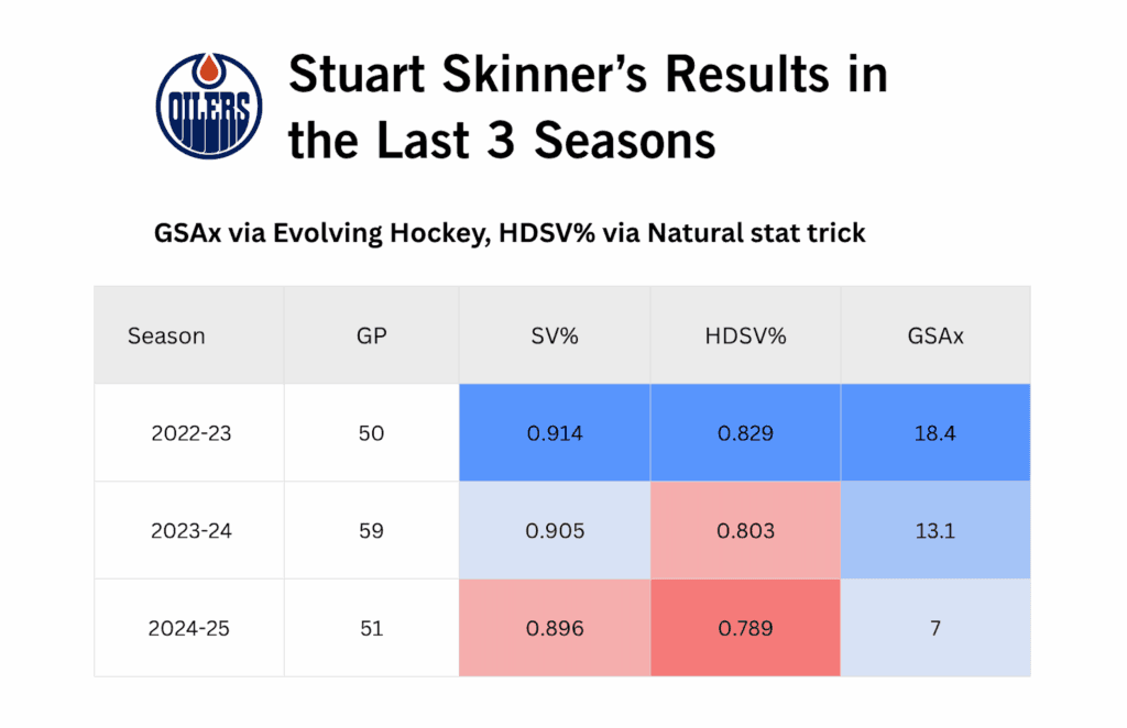 Since Skinner’s arrival in 2022-23, Edmonton ranks 15th in SV% and 13th in goals-against despite being a top-tier defensive team. They need their starter to step up and prove that he can be trusted.
