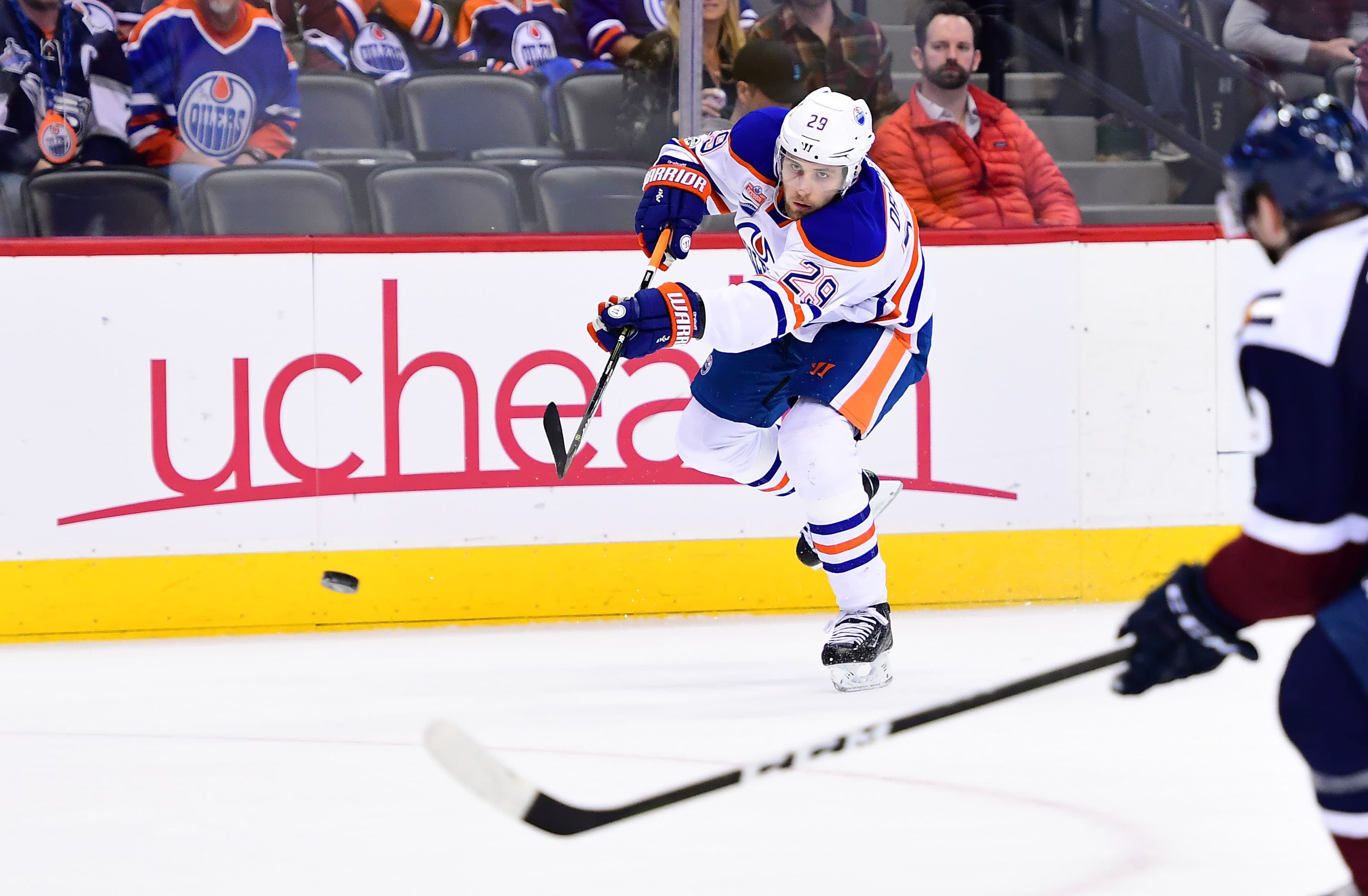 Edmonton Oilers center Leon Draisaitl (29) shoots and scores an empty net goal in the third period against the Colorado Avalanche at the Pepsi Center. The Oilers defeated the Avalanche 7-4. Mandatory Credit: Ron Chenoy-USA TODAY Sports