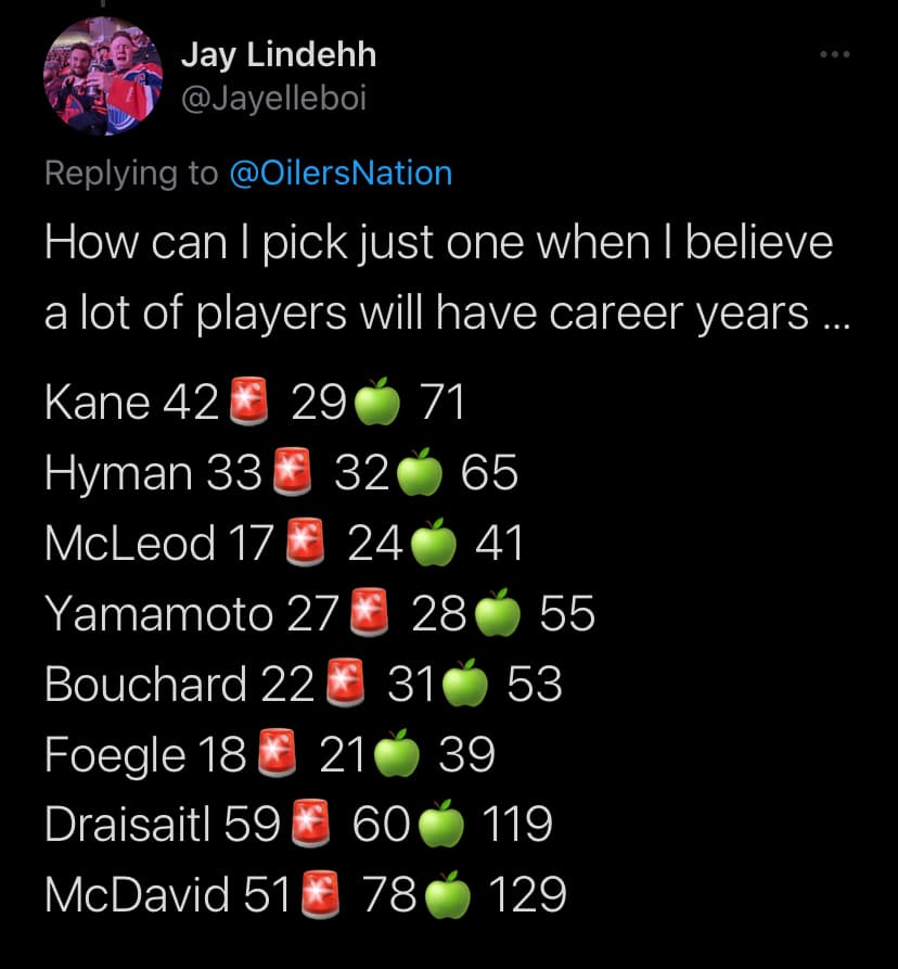 The more the merrier right? Jay here on Twitter shared his point predictions for a few players he believes can have career seasons! If the Oilers want to stay as an offensive powerhouse, they’ll definitely need more scoring from everyone.