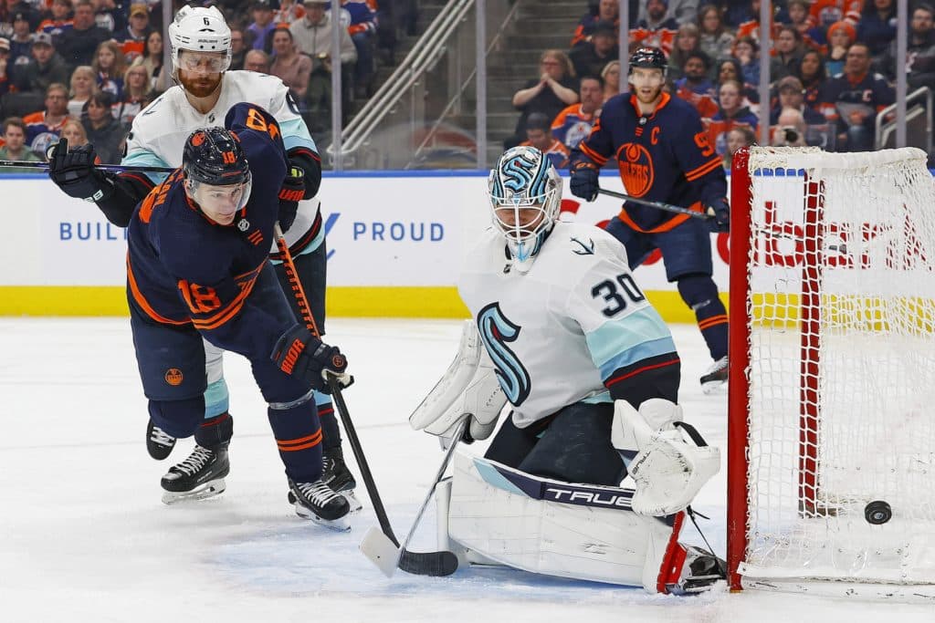Jan 3, 2023; Edmonton, Alberta, CAN; Edmonton Oilers forward Zach Hyman (18) deflects a shot just wide of Seattle Kraken goaltender Martin Jones (30) during the third period at Rogers Place. Mandatory Credit: Perry Nelson-USA TODAY Sports