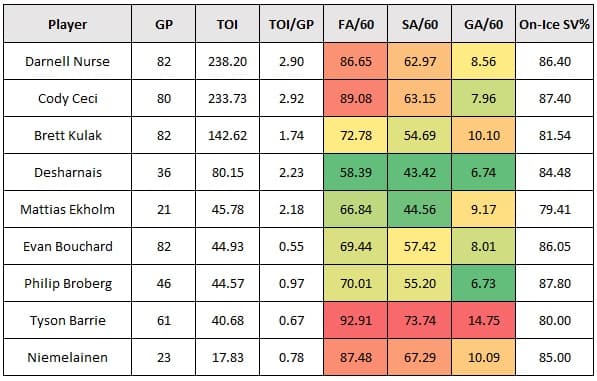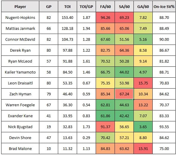 The first thing that stands out is the poor shot-suppression numbers with Nugent-Hopkins, Nurse or Ceci on the ice. At least one of them was killing penalties for 72% of the team’s total ice time last season and were clearly Woodcroft’s go-to players. And since they’re on the first unit, it’s expected that their rate of shots and chances is higher relative to their teammates as they’re facing the other team’s top units and typically their top offensive players. But even relative to the other units in the league, their on-ice numbers were pretty high.