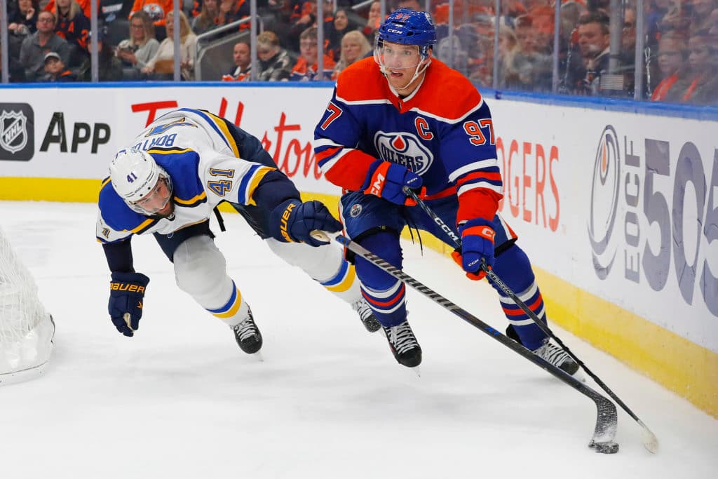 Oct 22, 2022; Edmonton, Alberta, CAN; St. Louis Blues defensemen Robert Bortuzzo (41) plays for the puck against Edmonton Oilers forward Connor McDavid (97) during the third period at Rogers Place. Mandatory Credit: Perry Nelson-USA TODAY Sports