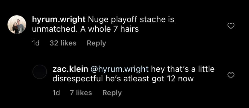 Nuge playoff stache! Hyrum.wright mentions how his seven hairs are unmatched, however, it might be a little more than that. Let’s be honest here, one of the highlights of last year’s playoff run was seeing how much hair Nuge could actually grow on his face. Bit of a patch on his chain as well!