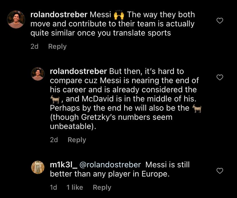 Rolando on Instagram has compared Connor McDavid to Lionel Messi! When I posed this question originally, this is who I thought Connor was most comparable to. The way Connor is able to handle the puck at such a high speed reminds me of how Messi is able to take on defenders with his dribbling ability. Connor’s puck control really reminds me of the way Messi is able to control the ball. They both have the skill to take on two – four defenders at once and score. Both are, in my opinion, the best players of their generation and for me, Messi is the greatest of all time, and I believe one day we will also view McDavid as the GOAT in Hockey!