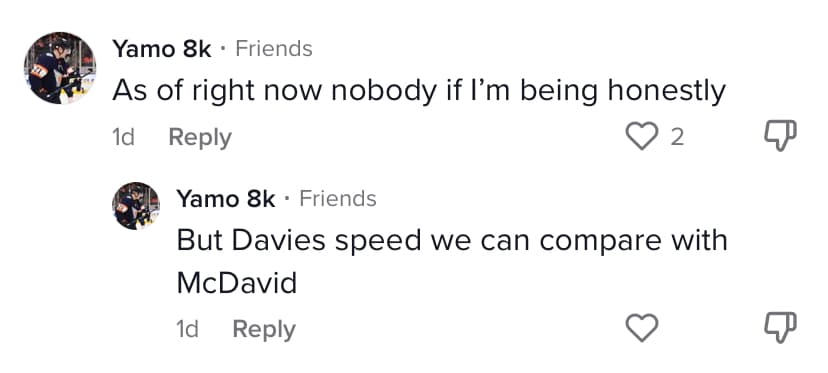 Yamo 8k thinks nobody in the soccer world right now comes close to Connor McDavid! At least there’s the speed comparison with Alphonso Davies!