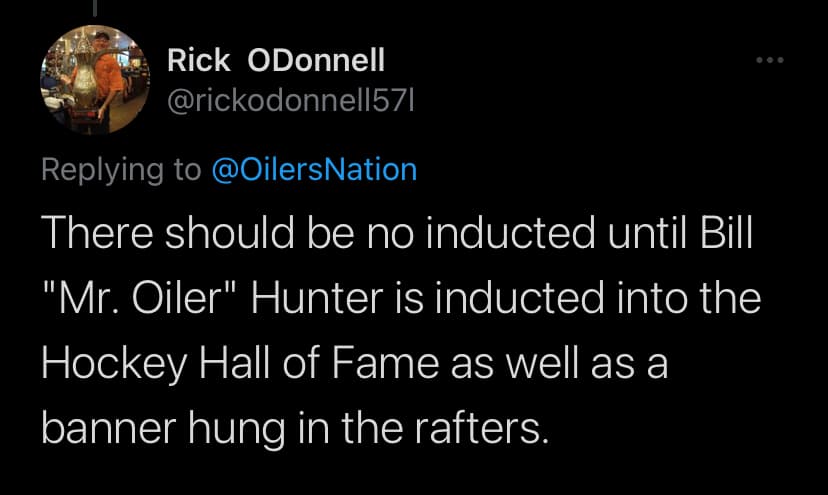 What a shout this is from Rick ODonnel! I love this idea as Bill Hunter is the reason we have the Oilers! Because of him the Birth of the Edmonton Oilers happened. And while the Oilers have a mascot named after him, it would be fitting if he was the first true inductee into the Oilers Hall of Fame. Is he deserving of a banner though?