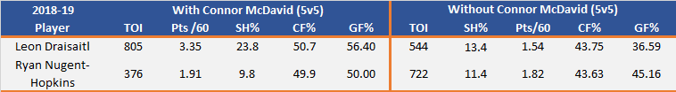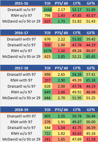 Draisaitl’s scored a bit better without McDavid than RNH. RNH has marginally better shot and goal numbers. The Oilers aren’t good enough and need to supply either player with more help on line two.