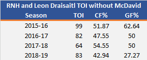 Neither Draisaitl or RNH can do it by themselves when asked to form a line without McDavid. The Oilers have consistently been outshot and outscored with either player running their own line.