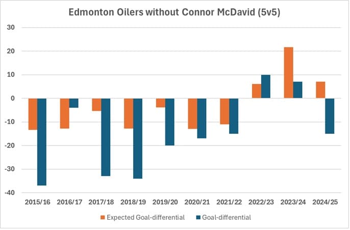 The bar graph below has two sets of data, broken down by each season that McDavid has been an Oiler. The first set in orange is the team’s expected goal differential at even-strength (based on the shots and scoring chances generated and allowed by the team – source) without McDavid on the ice by season. And the second set in blue is the actual goal differential without McDavid on the ice.
