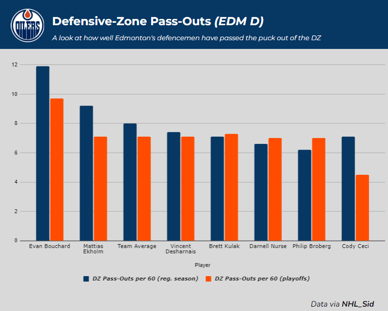 Nurse is not as effective at outlet passes. Among Edmonton’s defencemen in the regular season, he ranked second last in pass-outs per 60, only ahead of Broberg. He saw a slight improvement in the playoffs but remained below the team average regardless. Meanwhile, Ceci was somewhat of the opposite, as he was OK at pass-outs in the regular season, and then substantially declined in the playoffs.