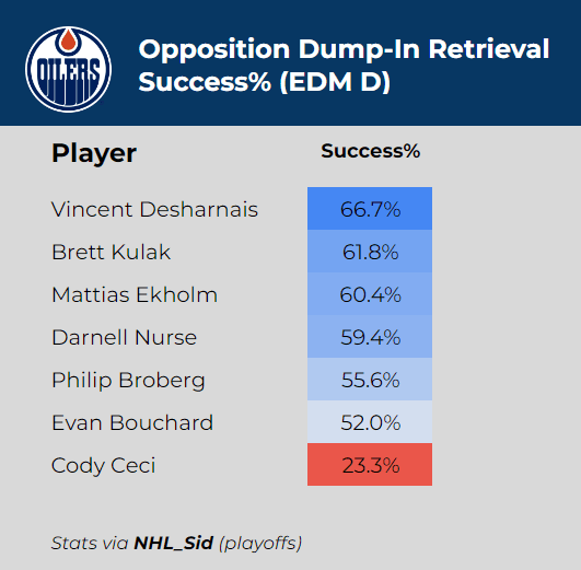 On the bright side, Nurse is solid in this area, and he gets the job done. On the other hand, the drop-off from the rest of Edmonton’s defencemen and Ceci is enormous. In the playoffs, when Ceci went back to retrieve an opposition dump-in, he was beaten to the puck by an opposition forechecker 13 out of 30 times, and in the 13 times he did win the race to the dump-in, he committed a turnover 6 times. Huge area of weakness for him.