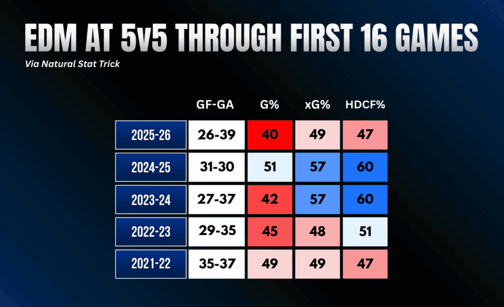 The last time they generated a lower rate of High-Danger Chances in a season than 8.76 was 2014-15. A team coached by Dallas Eakins that hadn’t yet drafted Connor McDavid. Yikes.