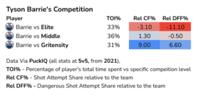 I believe that at this stage of his career, Barrie’s 5v5 play is more suited for a role on the third role rather than on the first pair. To begin, his metrics against top competition last year were quite poor.