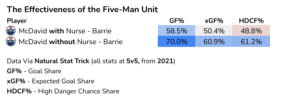 Simply put, McDavid’s play was superior without the Nurse – Barrie pairing last season as opposed to with. One of the major factors for these results was due to how Nurse and Barrie simply didn’t work defensively together. Barrie is prone to making numerous dangerous pinches and risky plays, while both he and Nurse would often have coverage issues in their own zone. They were fine offensively, but they didn’t have any defensive chemistry whatsoever, especially against top opposition. This turned out to be a hindrance on McDavid’s two-way play, especially when it came to high-quality shots.