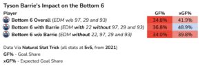 Oilers Now host Bob Stauffer stated that Barrie is currently “on a short leash,” and this was indeed proven true. The following game against Vegas on Friday night, Barrie moved down to the third pair alongside Kris Russell. Evan Bouchard started the game with Darnell Nurse, and the duo posted a 100% goal share, and an 81% expected goal share together in a 5-3 victory.