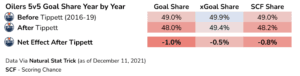 It’s a fascinating subject. Edmonton’s 5v5 play has indeed declined ever since the hiring of Dave Tippett, according to several key indicators.