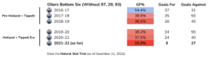 A major reason for Edmonton’s success in the 16-17 season was how that team could score with and without their best players on the ice. However, their bottom six declined in the two subsequent years, and it hasn’t seen much improvement under the new regime. In fact, the team without McDavid, Draisaitl, and RNH has become worse.